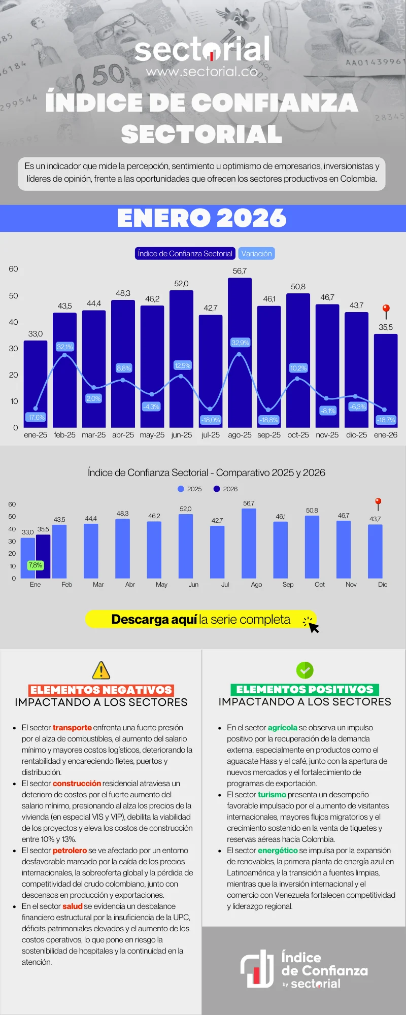 El Índice de Confianza Sectorial (ICS) se ubicó en 35,5 puntos en enero de 2026, representando un incremento del 7,8% frente al mismo mes del año pasado, cuando se encontraba en 33,0 puntos, y una reducción del 18,7% en relación con diciembre de 2025, cuando estuvo en 43,7 puntos.