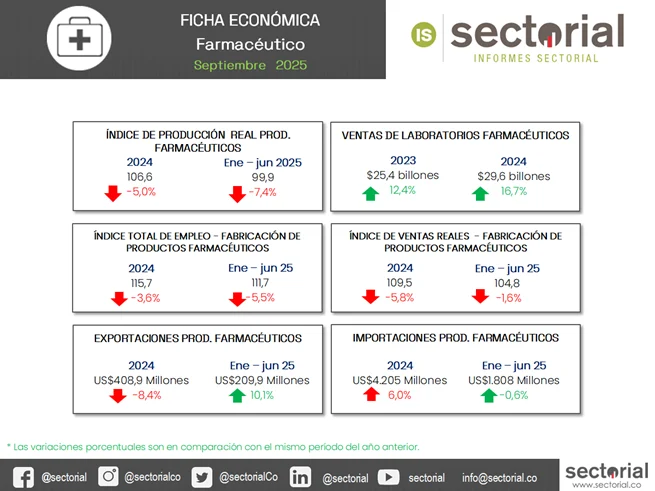 El sector farmacéutico colombiano atraviesa una coyuntura. A pesar de que las ventas nominales mostraron un crecimiento significativo del 16,7% en 2024, alcanzando los $29,6 billones, los indicadores de producción y ventas reales reflejan una contracción. El Índice de Producción Industrial (IPI) del sector cayó un 7,4% en el primer semestre de 2025, mientras que las ventas reales mantienen una tendencia negativa desde 2023, con una caída del 1,6% en el mismo periodo. Esta contracción se explica en gran medida por la crisis financiera del sistema de salud, que ha limitado el crecimiento de la industria local.