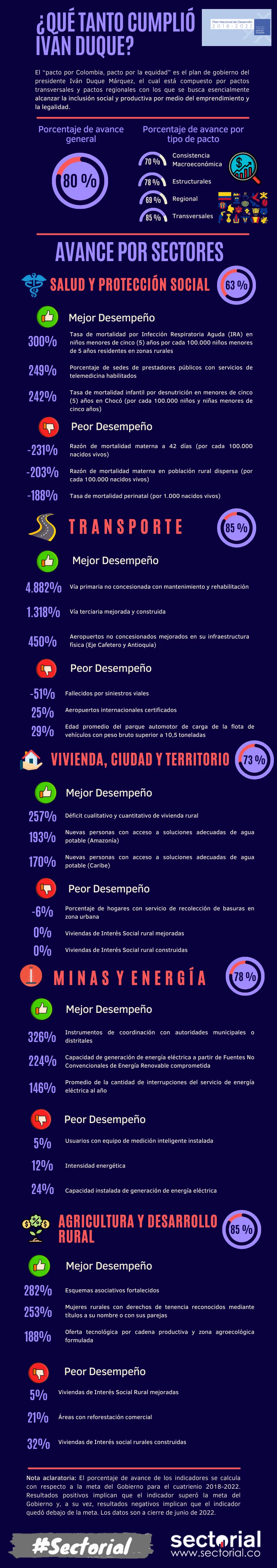 Por sectores, el porcentaje de avance registrado al 30 de junio de 2022 era: agricultura y desarrollo rural (85%), transporte (85%), minas y energía (78%), vivienda, ciudad y territorio (73%) y salud y protección social (63%).