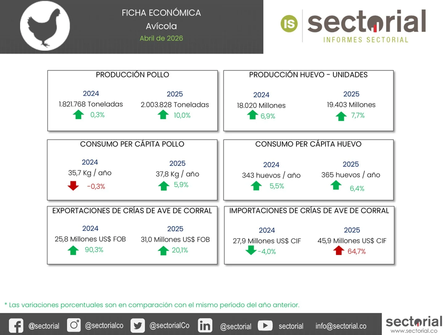 A pesar de los desafíos de rentabilidad registrados en el primer trimestre de 2026 por una sobreoferta estacional que contrajo los precios mayoristas del huevo en un 8,5 %, las proyecciones apuntan a un crecimiento del 3,7 % en la producción de pollo, alcanzando los 2,1 millones de toneladas. Para sostener este ritmo, el sector aseguró un flujo constante de alta genética con importaciones récord de US$ 45,9 millones en 2025, al tiempo que duplicó sus exportaciones de material genético hasta superar las 4.326 toneladas.