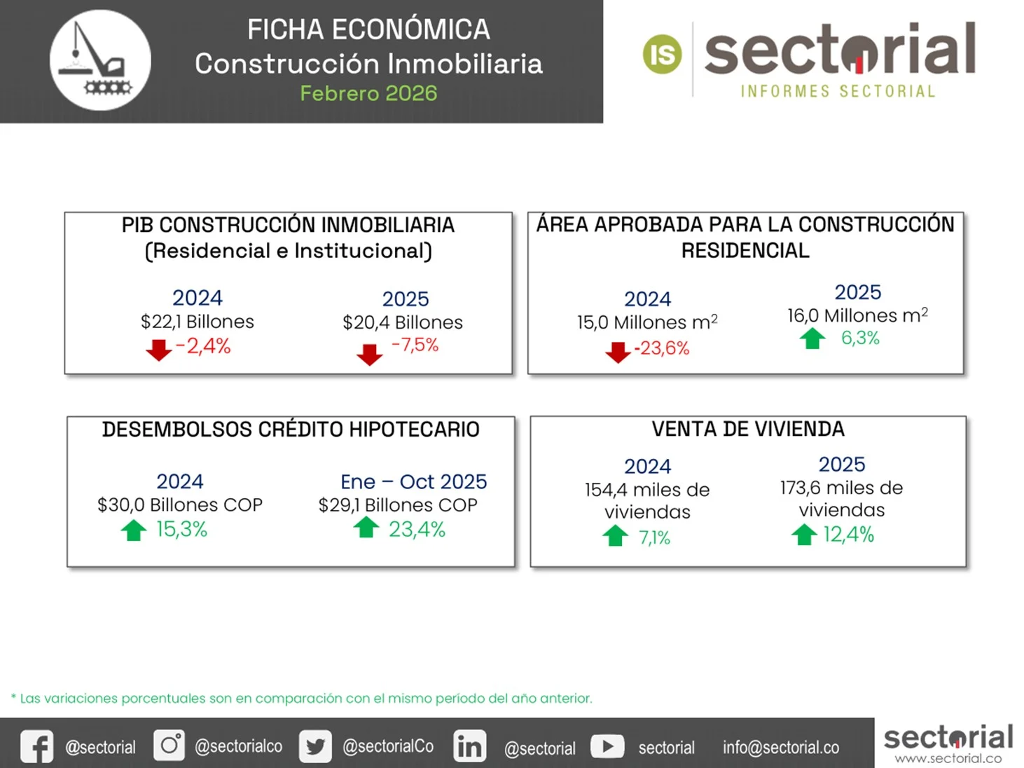 El sector de la construcción de obras inmobiliarias en Colombia cerró el 2025 en una fase de transición, caracterizada por una divergencia entre la actividad productiva y la dinámica comercial. El PIB de edificaciones registró una contracción consolidada del 7,5% en el total del año, acentuada por una caída del 6,5 % específicamente en el cuarto trimestre frente al mismo periodo de 2024. Este retroceso fue impulsado principalmente por el segmento no residencial, que se contrajo un 11,3 % al cierre del año. No obstante, la demanda mostró resiliencia con un repunte nacional en ventas del 12,4 %, alcanzando las 173.632 unidades comercializadas. Este impulso comercial se vio reflejado en un crecimiento del 23,4 % en los desembolsos de crédito y leasing habitacional en el periodo enero y octubre frente al año anterior.