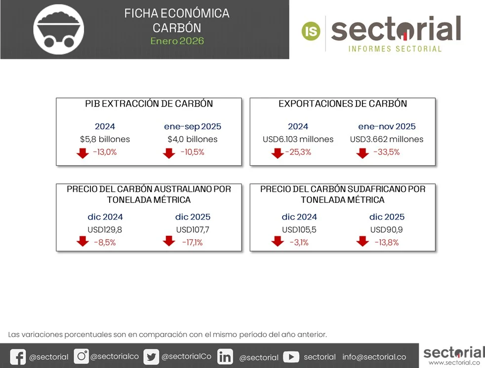 Entre enero y noviembre de 2025, las exportaciones colombianas de carbón alcanzaron USD 3.662 millones, registrando una caída del 33,5% frente al mismo periodo de 2024. En volumen, se enviaron 42,1 millones de toneladas (-24,2 %), mientras que el precio promedio de exportación descendió a USD 86,9 por tonelada (-12,3 %). La contracción se concentró principalmente en el carbón térmico (-34,0 %), que representa más del 94 % del total exportado, mientras que otros carbones bituminosos cayeron 24,9 %.