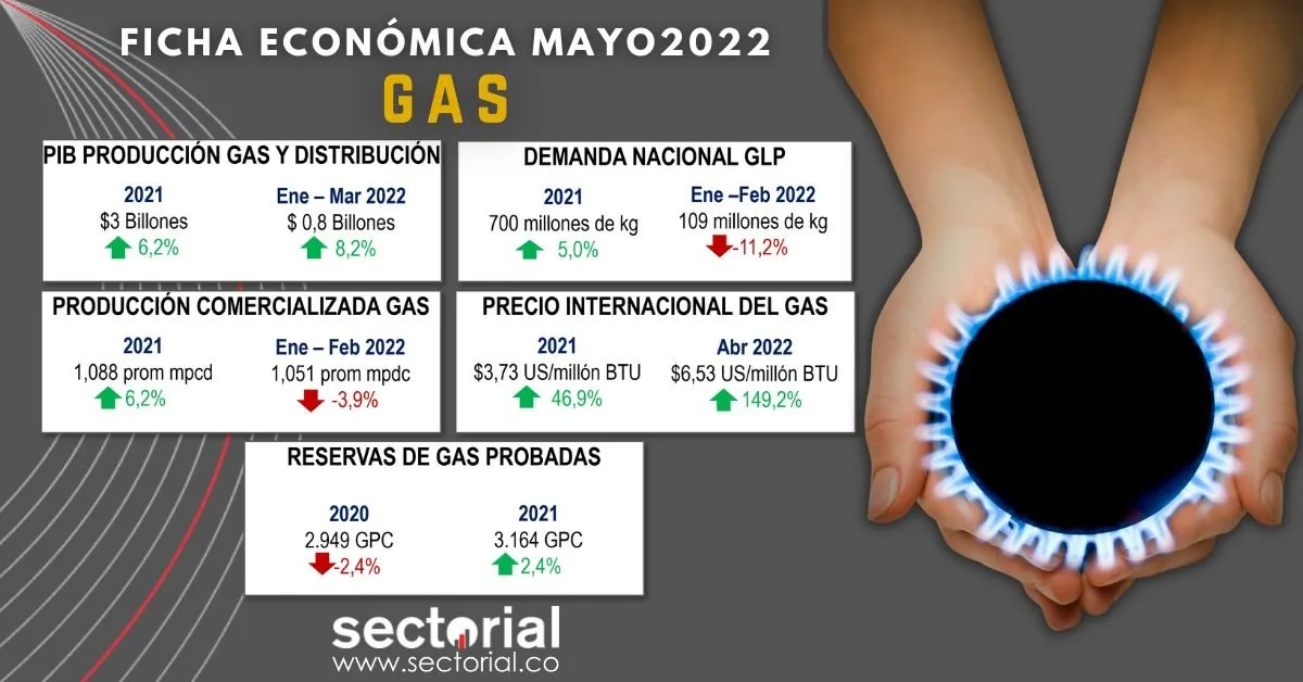 En 2021, la producción de gas fue la más alta de los últimos cinco años y la demanda de GLP presentó tendencia alcista durante este mismo periodo. Sin embargo, tanto la producción como la demanda de GLP han disminuido en los dos primeros meses del 2022 y el gas propano aumentará de precio, ya que al finalizar este semestre el gobierno no seguirá subsidiando el energético. Durante el 2022 se espera un aumento del 48% de inversión para la exploración y explotación de hidrocarburos, la más alta desde el 2014, aunque supeditada a las decisiones del nuevo gobierno. Además, Colombia aumentó a 8 años de autoabastecimiento en las reservas de gas natural y se puede convertir en un exportador en un mediano o largo plazo, gracias a los nuevos descubrimientos en la costa Caribe.