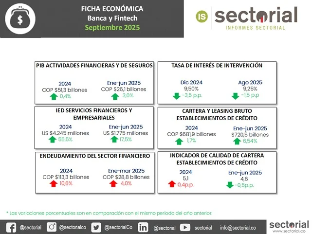 Durante el primer semestre de 2025, el sector de banca y fintech en Colombia ha navegado un entorno de recuperación económica moderada, evidenciado en un crecimiento del PIB sectorial del 3,0%. Este período se caracterizó por la reactivación de la cartera de crédito, que revierte su ciclo de contracción gracias a la paulatina reducción de las tasas de interés, impulsando principalmente el consumo.