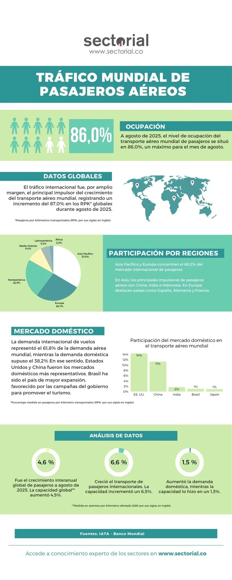 En contexto, el reporte mensual de la IATA señala que en agosto de 2025 la demanda global (medida en RPK) creció 4,6 % con respecto al mismo mes de 2024, mientras que la capacidad (ASK) aumentó 4,5 %, por lo que el crecimiento de la demanda apenas superó al de la oferta. En particular, el tráfico internacional creció 6,6 % y su capacidad aumentó 6,5 %, lo cual generó que el factor de carga internacional alcanzara niveles récord. En cambio, el crecimiento en el tráfico doméstico fue mucho más modesto: apenas 1,5 %, con un incremento de capacidad de 1,3 %.